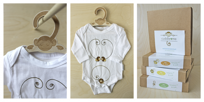 The bodysuit is made from wonderful and soft organic cotton. It has silk-screen printed pictures of animals with long tails on the back, chest and abdomen areas. The tails actually form directions, outlining basic strokes of infant massage. Therefore, the instructions are "printed" directly onto the child! (Genius, right?) It comes in a paper box, instructions with pictures are included.
