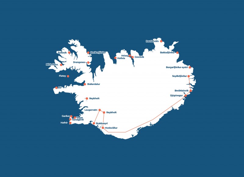 Stokkseyri, Laugarvatn, Reykholt, Hvolsvöllur, Djúpivogur, Breiðdalsvík, Seyðisfjörður, Borgarfjörðureystri, Bakkafjörður, Raufarhöfn, Grenivík, Hrísey, Hofsós, Drangsnes, Norðurfjörður, Súðavík, Bíldudalur, Flatey, Breiðafirði, Rif, Búðardalur, Reykholt, Vogar á Vatnsleysuströnd, Garður, Sandgerði and Hafnir.