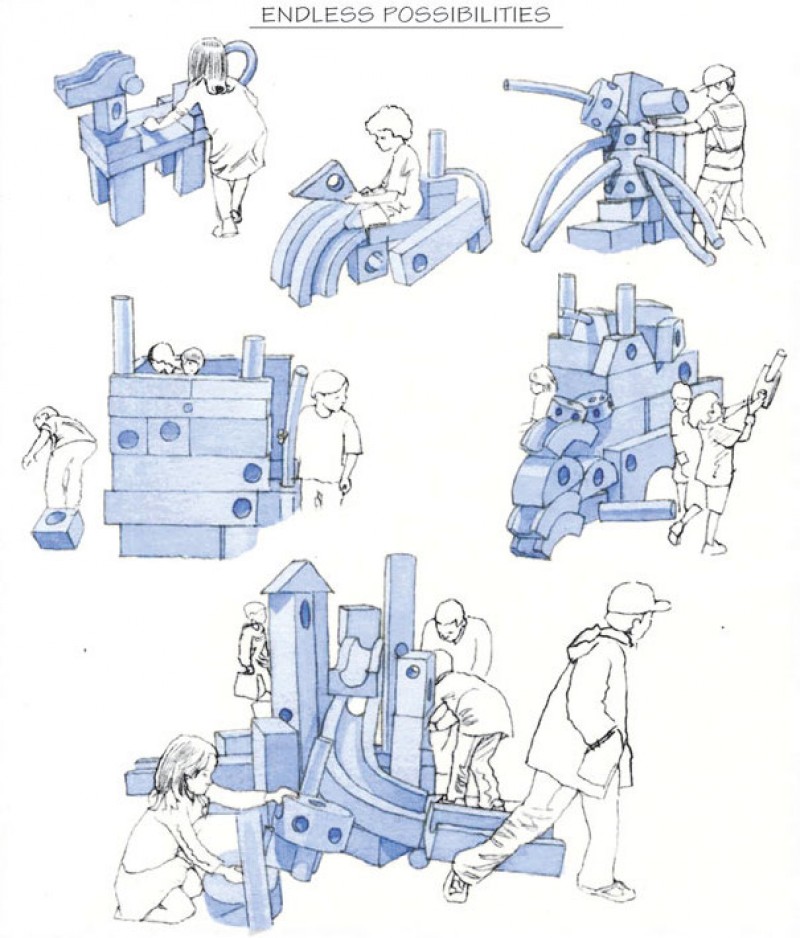 Leikvöllurinn frá Imagination Playground er framleiddur í Bandaríkjunum og samanstendur af hreyfanlegum kubbum í mismunandi lögun eins og teningum, tígulsteinum, tannhjólum, bugðum, kúlum og sívalningum. Kubbarnir eru búnir til úr umhverfisvænum og eiturefnalausum svampi sem þolir vatn, sól, hita og myglar ekki. Það er auðvelt að stafla þeim upp og hreyfa þá til þar sem þeir eru fisléttir. Börn fá tækifæri til þess að búa til sinn eigin leikvöll og skapa sína eigin veröld, hvort sem það er sjóræningjaskip, vélmenni, hús eða heil borg- möguleikarnir eru endalausir!