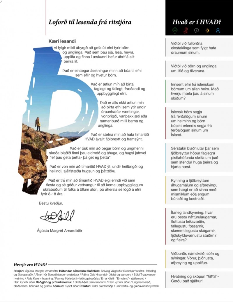 Það er trú mín að tímaritið HVAÐ eigi erindi við sem flesta og sé góður vettvangur til að koma uppbyggilegum skilaboðum til fólks á öllum aldri, þó áhersla sé lögð á efni fyrir 8-18 ára.