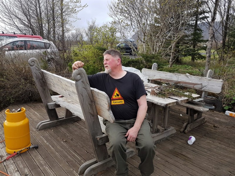 Hér að ofan sést smiðurinn, Guðjón frá Dröngum og hann situr á bekk sem svipar til þess sem verður smíðaður til minningar um Sollu. Sollubekkur verður þó aðeins meiri um sig og útskurður fjölbreyttari og auk þess verður nafn hennar skorið út og setning í hennar anda. Bekkurinn verður svo tryggilega festur til að þola vetrarstormana.