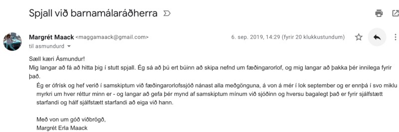 Ásmundur hefur ekki svarað þessum tölvupósti en ég bíð spennt. Samkvæmt nýjasta fréttaflutningi hefur hann áhuga á að lengja fæðingarorlofið sem er mjög jákvætt og hækka hámarkgreiðslurnar - en lítið hefur verið skrifað um lágmarksgreiðslur eða að minnka flækjustig umsækjenda.