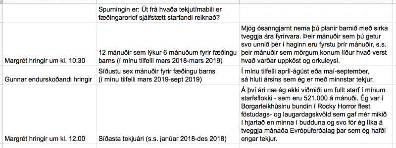 Af hverju hef ég ekki rétt á meira orlofi? Þessi efnisgrein er leiðinlega og flókna efnisgreinin. Barnið mitt var ekki planað - en afskaplega velkomið samt. Vandamálið felst í því að á því tímabili sem kemur til útreikninga var ég annars vegar launamanneskja og hins vegar sjálfstætt starfandi og það lítur út fyrir að kerfið geri ekki ráð fyrir fólki sem sveiflast svona á milli. Samkvæmt útreikningum Fæðingarorlofssjóðs ætti ég að hafa 521.000 í tekjur á mánuði til að ná því að vera í 100% vinnu að þeirra mati. Ég næ því lágmarki ekki á þeim tímabilum sem mögulega eru reiknuð inn.
