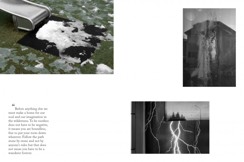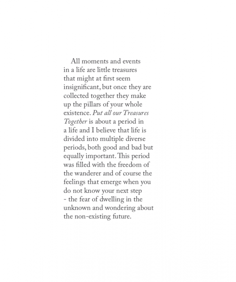 The work ,,Put all our Treasures Together” is about a period in a life. A rootless, wandering, travelling life. The viewer is taken on a trip through photographs that serve as little treasures on the walk through life. With the qoute from writer Annie Dillard being a perfect summary ,,How we spend our days is, ofcourse, how we spend our lives.”