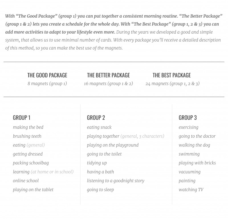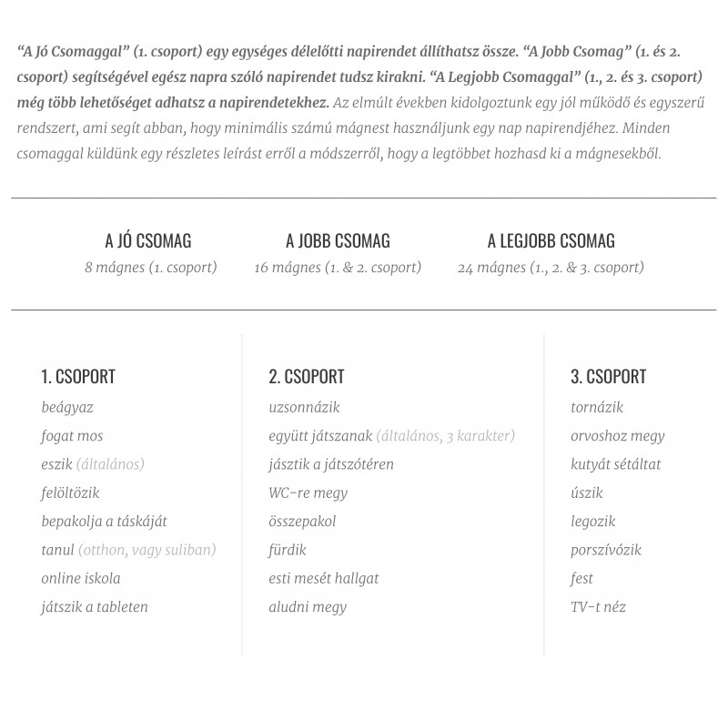 A kampány alatt három csomagból lehet választani — minden csomagban nyolc mágnes van (három nyelven elérhetõk). Az elsõ kettõ alkalmas arra, hogy egy egyszer? napirendet állítsunk össze a leggyakoribb tevékenységekkel. A harmadik inkább nem mindennapos tevékenységeket tartalmaz. Késõbb, ha a kampány sikeres lesz, szeretnénk sokkal több tevékenységbõl mágnest készíteni, és az a cél, hogy lehetõség legyen összeválogatott csomagokat is vásárolni.