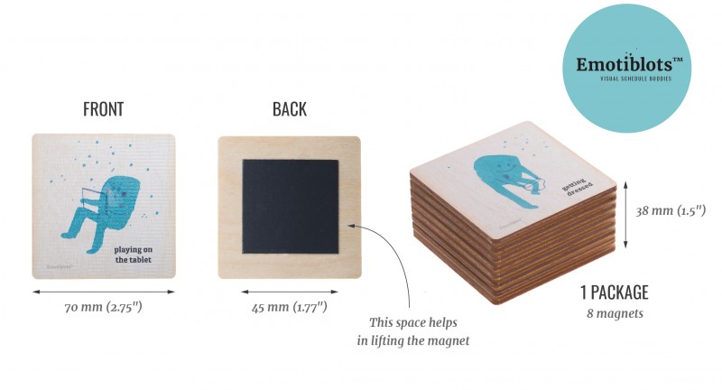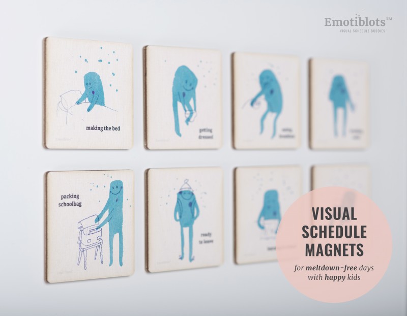 I started to paint the Emotiblots™ schedule cards for him to make sure he feels safe and happy. With the cards, creating daily schedules became simple. There are more than 80 of them by now (both emotion & schedule cards). Since then, the printables helped more than 1,000 kids become happier by making them feel “in the loop”. After a while, we started to experiment with a more durable version. Therefore the magnets were born.
