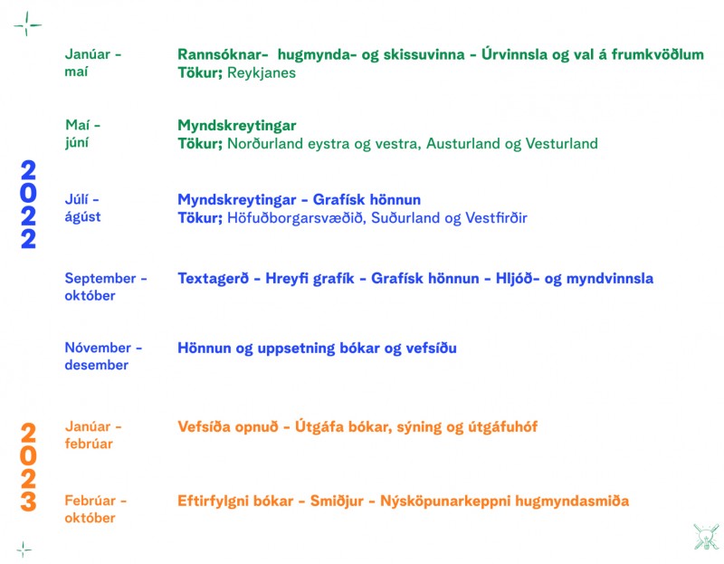 Tímalína verkefnisins spannar frá upphafi árs 2022 og áætlað er að gefa bókina út og opna vefsíðuna í byrjun árs 2023.