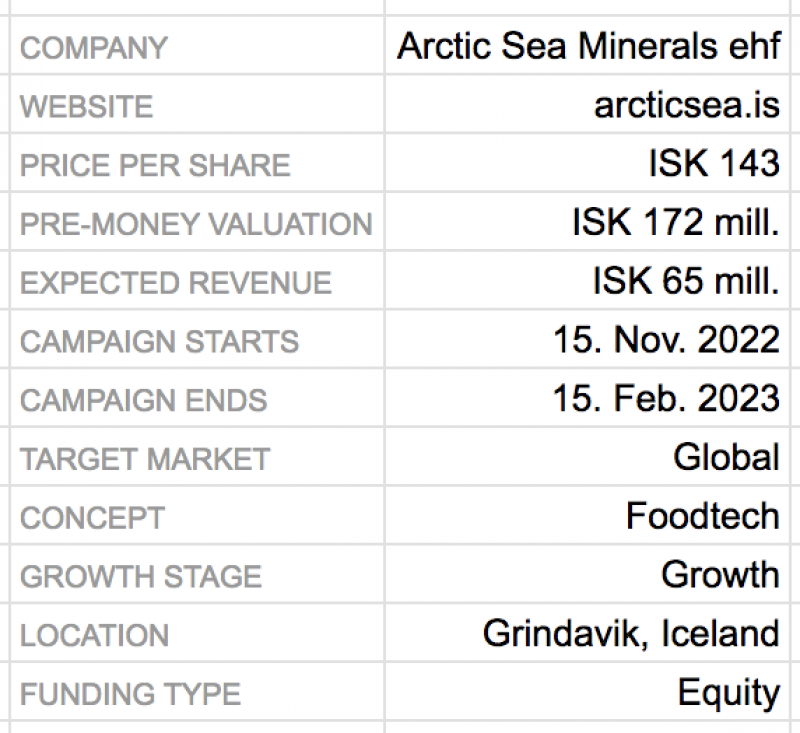 LifeSalt is low-sodium table salt which is produced from seawater and geothermal brine. It just contains 40% of the sodium of regular table salt. Overconsumption of sodium is one of the main reasons for cardiovascular diseases and an important preventive measure is decrease in salt consumption or switching to low sodium salts. Arctic Sea Minerals has developed a new production method for low-sodium salt which contains besides sodium chloride, potassium chloride and magnesium salts. It also contains all the trace minerals of seawater that are vital for the human metabolism. The company is stationed in Grindavik, southwest Iceland, and aims at enlarging its production unit and exporting the product. For that a significant amount of capital is needed and this funding is part of it.