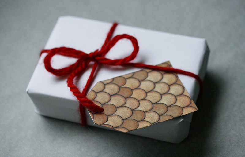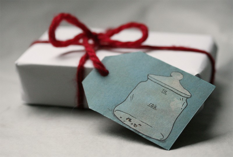 Merkimiðinn á jólapakka (tóma krúsin öðru megin, piparkökumynstur hinum megin).