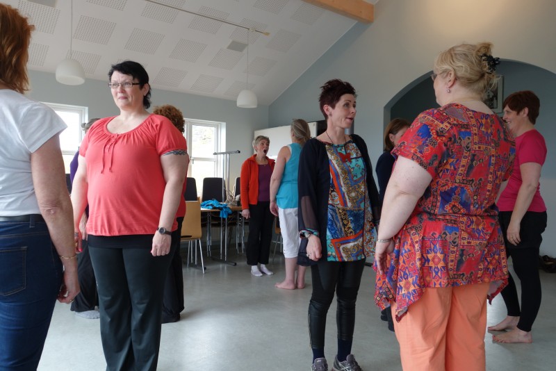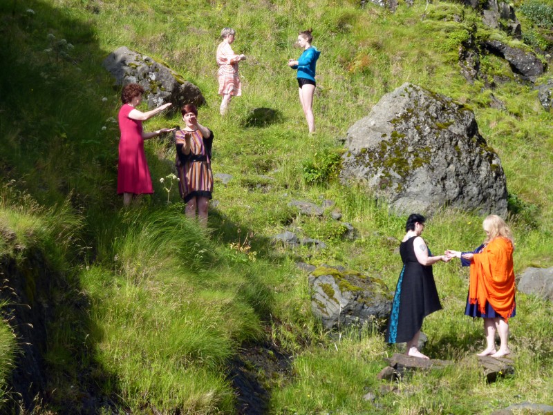 “Móðir mín í kví kví” is the Icelandic name of the original song,which in the process turned out to be the starting point for improvisations in movements and singing. Gróa, Heike, Ursula and ten female singers worked for one week on the improvisation with the song and the landscape. On July 30 the performance took place at the pool.