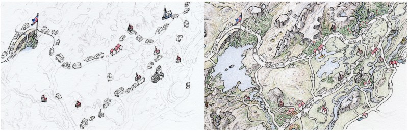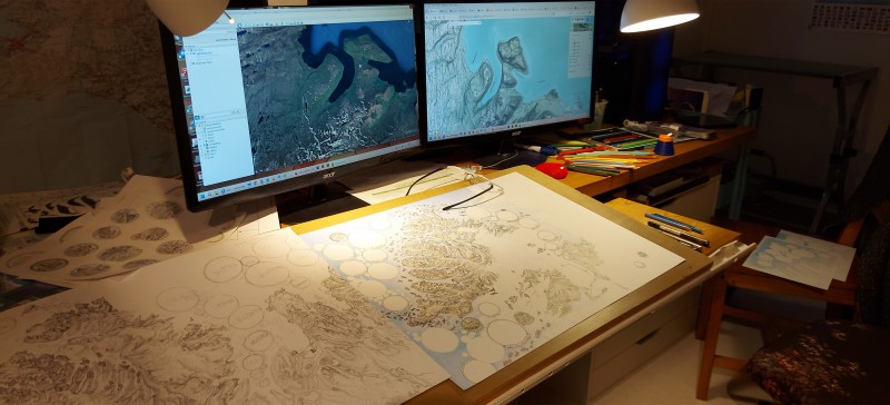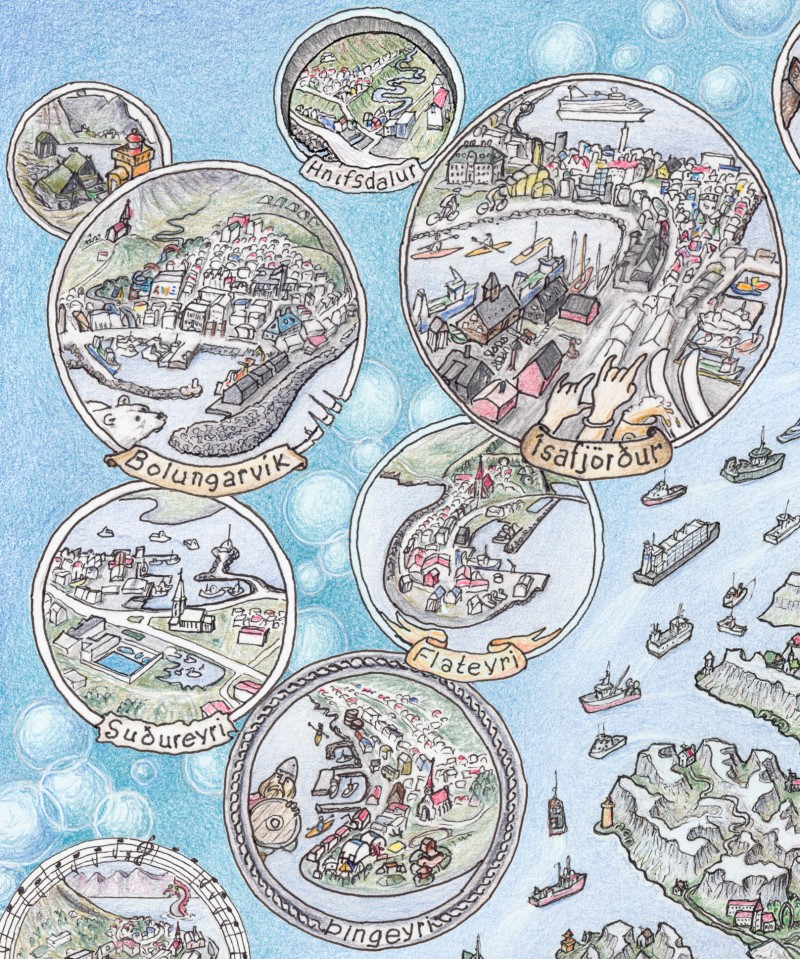 “The idea is to publish a map that I have been drawing for the past two and a half years. It shows the entire country. The main tourist attractions are drawn (waterfalls, churches, etc.) BUT also the land between them. The map shows landscapes as much as destinations. Small "portraits" of all the country's towns and villages are arranged in the sea around the country. The map will be folded in gift boxes and rolled up in cylinders. Its size will be A0. The goal is for tourists to be able to buy it in bookstores and elsewhere. This is the first map in a series of maps that I hope I will manage to draw in my lifetime.”