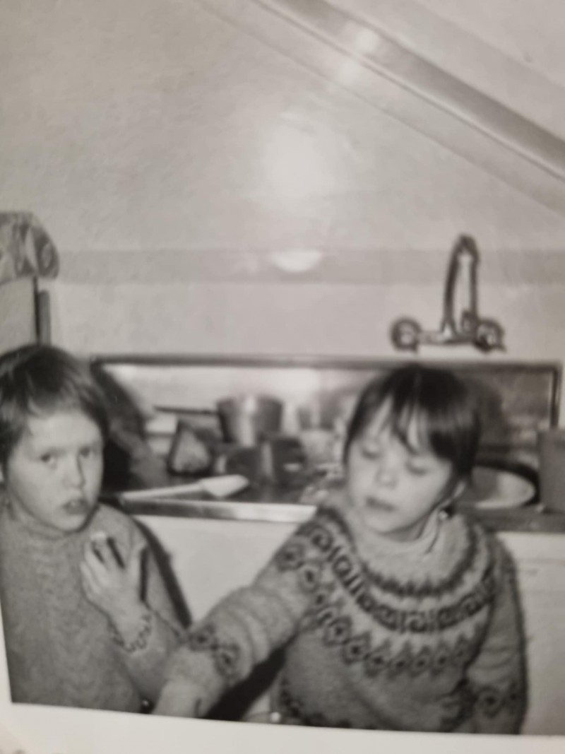 Hér er ég til hægri og Indíana systir mín til vinstri, hún var þremur árum eldri en ég, þó að það sjáist ekki þarna. Indíana var elst af okkur systkinum og lést árið 2024.