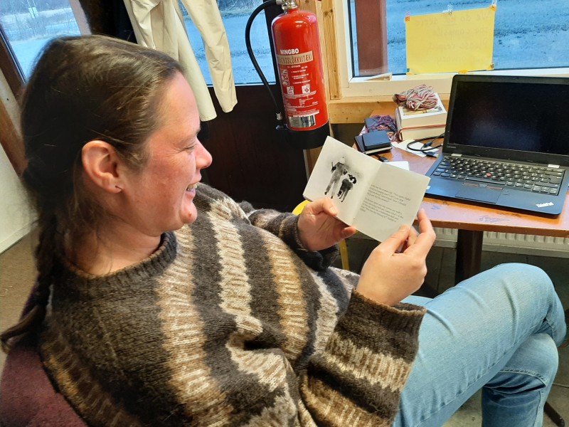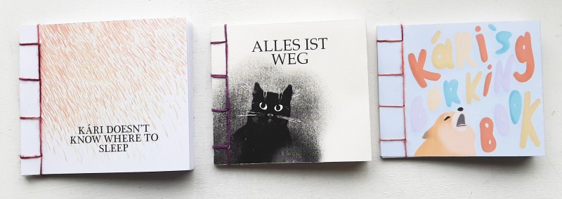 At the same time, Kristel Maamäki and Mette Mari Kaljas from Tartu in Estonia, and Alana Salguero from the United States, were also here. They loved the stories and created illustrations for them, laid them out as books that were then hand-sewn into beautiful bindings. Other artists at the residency also took part in that work.