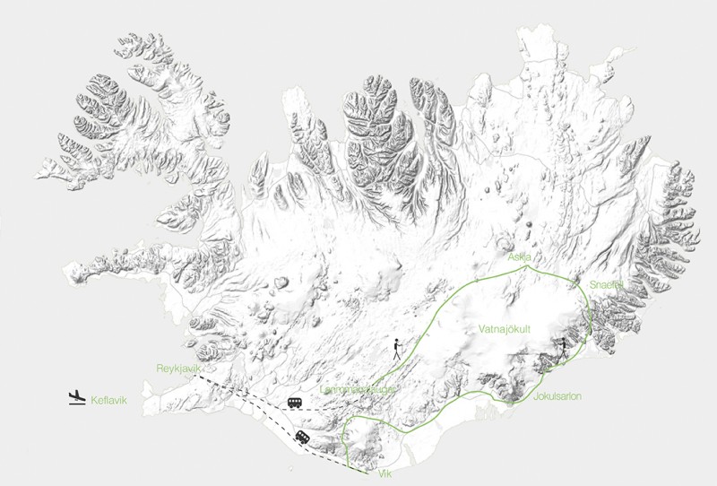 Il tragitto di “Iceland15” inizierà da Landmannalaugar. Una volta li camminerò in senso orario attorno al più grande ghiacciaio islandese, il Vatnajokull, toccando mete quali Askja, Snaefell,Lónsöræfi, Joekulsarlon, Skaftafell, Fjaðrárgljúfur, Maelifell, Laugavegur Trekking. Il percorso si concluderà a Vik, paese sulla costa meridionale dell'isola, non prima di aver ammirato l'unica “attrazione turistica”, ovvero la carcassa di aereo DC3.Il percorso è della lunghezza di 800km circa.