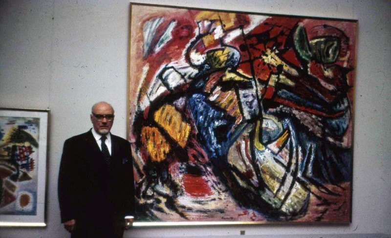 Jón standing next to a painting named Iceland no. 5 and is part of a series called The Ode to Iceland. It was painted in 1964 and is owned by the National Gallery of Iceland/ Jón stendur við hliðin á málverki sem fékk nafnið Ísland nr. 5 sem er partur af seríunni Óður til Íslands. Myndin var máluð árið 1964 og er í eigu Listasafns Íslands.