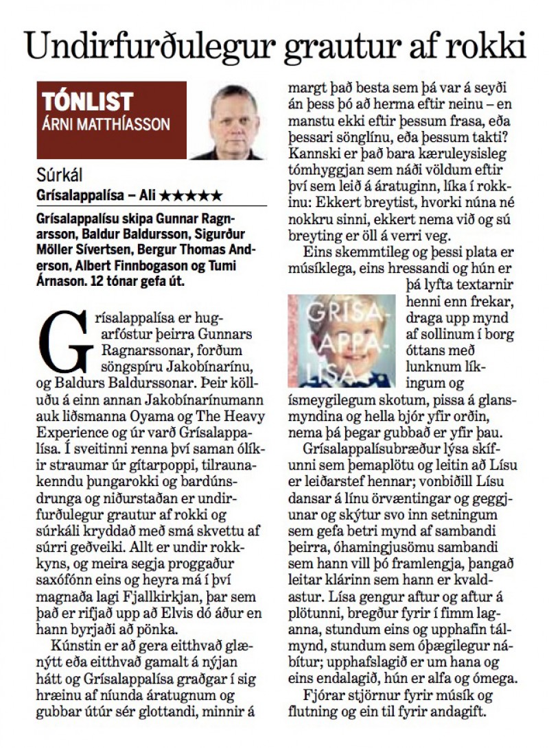 “A new voice has emerged in Icelandic rock—it is loud, angry, literate and groovy”. Grísalappalísa is a seven-piece pop outfit from Reykjavik, Iceland. Armed with razor-sharp lyrics and block rockin’ beats, Grísalappalísa’s shows and musical output are second to none.”